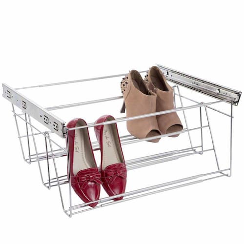 Sapateira Tripla ExtensívelProduto confeccionado em aço carbono, com tubos extensores em alumínio. .Acompanha trilhos telescópicos, que vão desmontados na peça.O uso ideal é dentro de armários, com fixação horizontal lateralmente.O aramado tem o acabamento cromado e o alumínio anodizado fosco.Sua capacidade é de 9 pares de calçados em seu menor tamanho e ainda comporta bolsas e malas. Em seu maior tamanho a capacidade de sapatos varia dependendo do tamanho e modelo.Largura ajustável de 570 a 770mm.Medidas totais: de 470 a 770x280x460mmCódigo: 8026