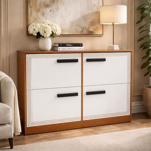 O(a) Sapateira Valência 4 Portas Branco/Freijó - Politono é produzido em MDP na escala de brilho Semi-Fosco, e possui um grau de dificuldade de montagem: Médio.