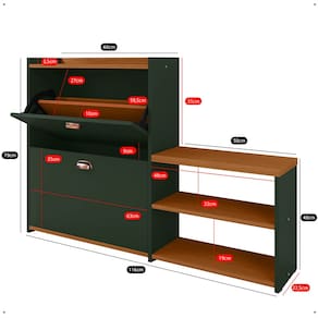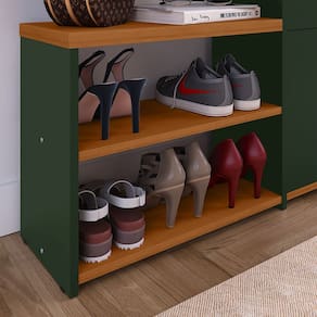 INFORMAÇÕES DO PRODUTO: * Altura: 79 centímetros; * Largura: 116 centímetros; * Profundidade: 22,5 centímetros; * Peso suportado: * Banco: 65 Kg * Corpo: 15 kg bem distribuídos * Peso total suportado: 80kg bem distribuídos; * 1 Prateleira; * Acompanha sapatas; * 2 Gavetas Basculantes; * Puxador Concha (Lauren); * Produzida em MDP 15mm e 25mm; * Comporta até 21 pares de calçados; * Não recomendado para calçados de numeração acima de 40; * Não recomendado para calçados de cano alto, como: Botas e Coturnos;