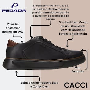 Esse tenis em couro preto é super confortável e estiloso. Onde for vá leve, essa é a sensação que queremos passar na linha Levi, pois o solado é feito em Eva, com a nossa Tecnologia LEVITECH, pesando menos de 250 gr por pé, proporcionando muita leveza. Isso significa momentos de conforto extremo a qualquer hora. E não acaba por ai, o modelo ainda possui o nosso sistema "FAST PIN", que é um cadarço elástico com uma ponteira em metal que permite o ajuste sem a necessidade de amarrar, trazendo muita praticidade na hora de calçar. Feito para o dia a dia do homem moderno, esse tênis é versátil, combina com diferentes propostas de looks e acompanha você desde o escritório até a viagem de fim de semana.