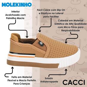 Molekinho é ideal para o seu pequeno ter conforto e leveza no dia a dia. O modelo possui o cabedal em sintético, fechamento calce fácil e palmiha têxtil e macia. Sua sola é emborrachada para maior segurança na pisada. Muito estilo e conforto em um só calçado!
