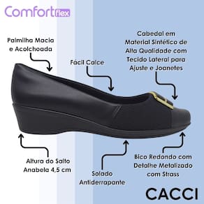 A palmilha interna é macia e acolchoada, garantindo uma experiência extremamente confortável mesmo em longos períodos de uso. O salto anabela de quatro centímetros e meio oferece altura na medida certa para quem deseja um visual mais elegante sem abrir mão da estabilidade e leveza ao caminhar. O solado conta com base antiderrapante, proporcionando segurança em todos os tipos de piso, seja no ambiente de trabalho ou em momentos de lazer.