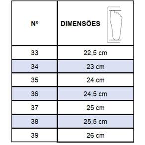 Recomendações de Uso: A limpeza do calçado pode ser feita com Detergente neutro e pano úmido. Não deixar submerso em água e não utilizar nenhuma forma de calor para secar. Guardar em local sem umidade.