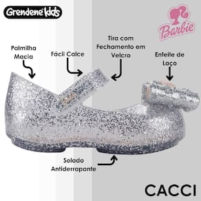 Com cores brilhantes e um toque de glitter mágico, cada passo é uma aventura cheia de brilho. O maxi laço, adornado com o rosto adorável da Barbie, adiciona um toque de glamour extra, enquanto os detalhes em hotstamp garantem que cada olhar seja único.