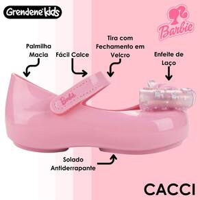 Com cores brilhantes e um toque de glitter mágico, cada passo é uma aventura cheia de brilho. O maxi laço, adornado com o rosto adorável da Barbie, adiciona um toque de glamour extra, enquanto os detalhes em hotstamp garantem que cada olhar seja único.