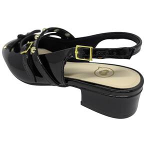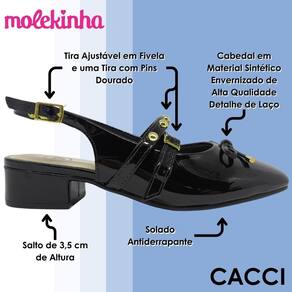 O cabedal em material envernizado de alta qualidade traz um visual sofisticado, com acabamento brilhante que realça cada detalhe do design. O laço delicado na parte frontal adiciona uma dose de romantismo ao modelo, enquanto as tiras com pins dourados dão um toque moderno e cheio de personalidade. Para completar, a tira ajustável que permite um ajuste preciso e seguro, facilitando o calce e garantindo mais firmeza ao caminhar.
