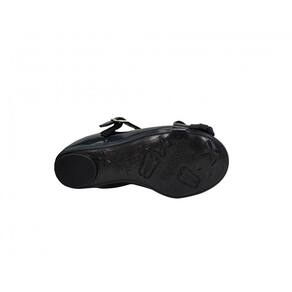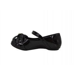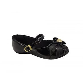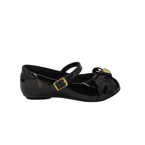 * Cabedal confeccionado em sintético, com acabamento levemente envernizado;* Forro em têxtil;* Fechamento com fivela, no peito do pé;* Bico redondo;* Palmilha removível de espuma, proporcionando maior conforto aos pés;* Detalhe metalizado em formato de coração, com laço na parte frontal;* Solado emborrachado antiderrapante;* Altura do solado: 0,5cm aproximadamente