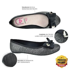 A Sapatilha Molekinha 2502387 tem o cabedal com tecido revestido de glitter e laço super fofo com biqueira em formato de coração, perfeita para deixar o look das meninas com muito brilho e charme. Palmilha plana de EVA revestida de tecido para o máximo de conforto. O solado é de material TR antiderrapante, garantindo mais segurança e estabilidade ao caminhar