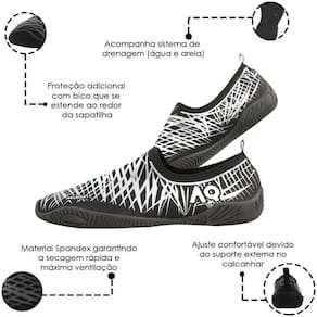 Solado: Borracha flexível; proteção na ponta dos pés e com sistema de drenagem para água e areia