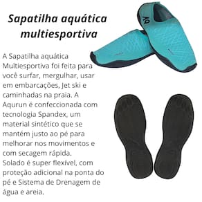 A Sapatilha aquática Multiesportiva foi feita para você surfar, mergulhar, usar em embarcações, Jet ski e caminhadas na praia. A Aqurun é confeccionada com tecnologia Spandex, um material sintético que se mantém justo ao pé para melhorar nos movimentos e com secagem rápida.