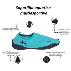 A Sapatilha aquática Multiesportiva foi feita para você surfar, mergulhar, usar em embarcações, Jet ski e caminhadas na praia. A Aqurun é confeccionada com tecnologia Spandex, um material sintético que se mantém justo ao pé para melhorar nos movimentos e com secagem rápida.