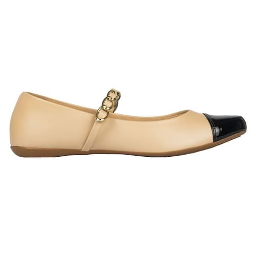 Sapatilha moderna e confortável. Com tira no peito do pé, estilo sapato boneca, com detalhes simulando uma corrente.