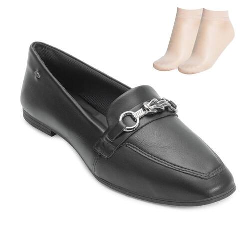Nome: Sapato Dakota e Meia DT24-DA431. Gênero: Feminino. Indicado Para: Dia a dia. Ocasião: Casual. Material Externo: Alternativo com recortes e costuras. Material Interno: Têxtil macio. Detalhe: Fivela metalizada no cabedal. Palmilha: Anatômica e macia. Solado: Borracha antiderrapante. Tipo de Salto: Baixo 1 cm. Solado: Borracha antiderrapante. Peso do Produto: 625 g (o peso varia de acordo com a numeração). Garantia do Fabricante: Contra defeito de fabricação. Origem: Nacional. Código Produto: 02151679. Marca: Dakota. Acompanha um par de meias fina tamanho único. Composição: 85 % Poliamida. 15 % Elastano.