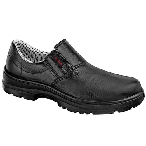 Sapato de segurança confeccionado em couro vaqueta integral estampa relax, com elástico nas laterais, sem biqueira. Possui palmilha interna removível em EVA com tratamento antimicróbios. Indicado para serviços em áreas que apresentem riscos de natureza leve, uniformizando e garantindo conforto e proteção aos pés do usuário.