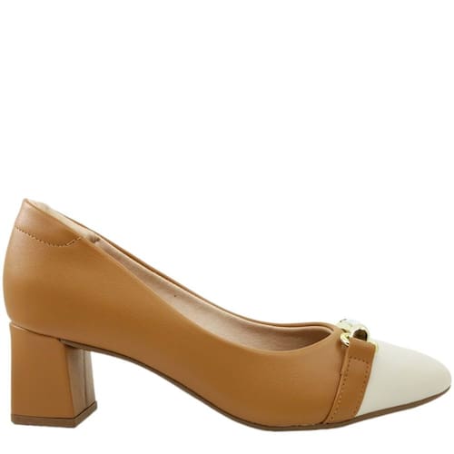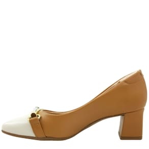 Confeccionado com material sintético de alta qualidade. Seu cabedal completamente fechado nas laterais e calcanhar, oferecem praticidade e um ajuste mais confortável, sem machucar os pés durante o dia a dia, mas sem abrir mão do estilo, garantido pelo aplique metalizado e o recorte em cor contrastante presente na ponta do pé. A palmilha acolchoada traz maior conforto e comodidade aos pés. Possui um salto grosso com 5cm em borracha antiderrapante.