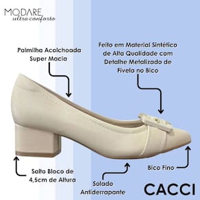 Seu salto bloco de 4,5cm proporciona altura na medida certa, com muito mais estabilidade ao caminhar. A palmilha super macia e acolchoada abraça os pés com suavidade, oferecendo conforto prolongado durante todo o dia. O bico fino valoriza o visual e alonga a silhueta, sem causar incômodo.