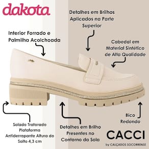 Feito em material sintético, o sapato é durável e de fácil manutenção. Com um peso de 0.767 kg, proporciona conforto ao caminhar. A altura do salto oferece um leve elevação, conferindo um toque de elegância sem comprometer o conforto. O sapato Dakota é uma escolha versátil que combina com diferentes estilos e pode ser utilizado tanto no dia a dia quanto em momentos de lazer ou no trabalho, garantindo um visual contemporâneo e estiloso em todas as ocasiões.