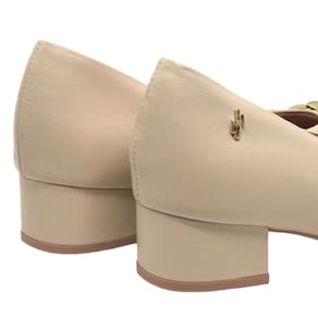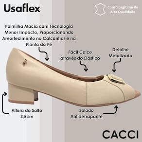 Peep toe cabedal em couro napa valise e tecido para joanetes. O modelo possui tecnologia Menor Impacto, proporcionando amortecimento no calcanhar e na planta do pé, oferecendo conforto principalmente para pessoas com esporão de calcâneo e metatarsalgia.