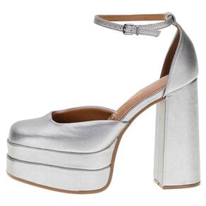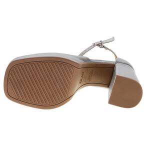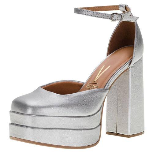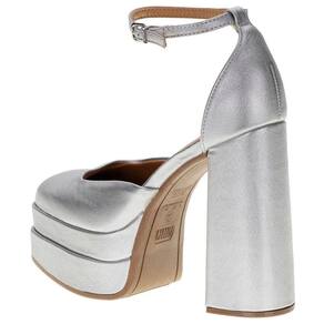 A Sandália Feminina Salto Grosso Vizzano é confeccionada em material metalizado com acabamento em costura, fechamento por fivela de ajuste, palmilha em PU e solado em borracha antiderrapante com salto grosso de treze centímetros aproximadamente e meia pata de cinco centímetros.