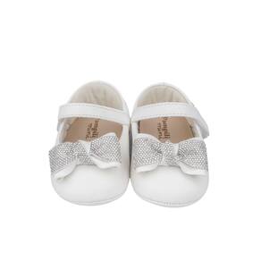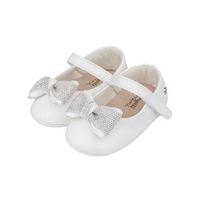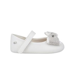 Sapato de bebê feminino em sintético branco com laço adornado em manta de strass super charmoso! Sapato com forro em tecido que auxilia na absorção do suor e espuma para acolher e cuidar dos pezinhos sem interferir no desenvolvimento natural. Sapato infantil flexível com calce fácil, facilitando o dia a dia da mamãe!
