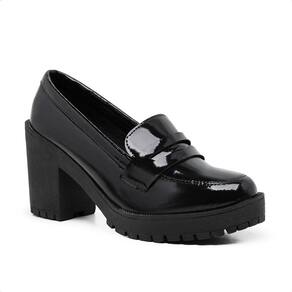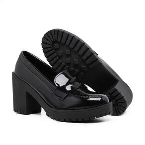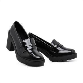 Sapato Salto Médio Tratorado Mocassim Slip On Casual Preto Verniz