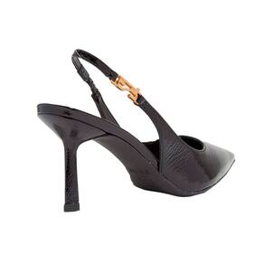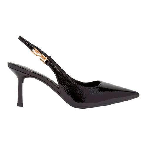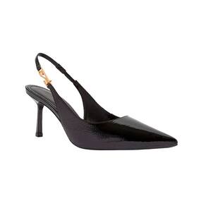 O scarpin slingback envernizado, possui salto médio fino, logo metalizado na cor dourado na lateral e bico fino. É uma peça refinada e versátil, perfeita para mulheres que buscam elegância e conforto em um único calçado.