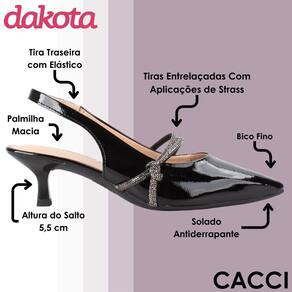Clássico, elegante e extremamente versátil, o sapato de salto baixo Dakota é aquele modelo que une conforto e estilo com maestria. Com bico fino e salto fino de 5,5 cm, ele garante um visual sofisticado, ideal para quem busca elegância sem abrir mão da praticidade no dia a dia. As tiras com brilho sobre o pé trazem um toque de glamour na medida certa, deixando o modelo ainda mais especial para compor produções refinadas.