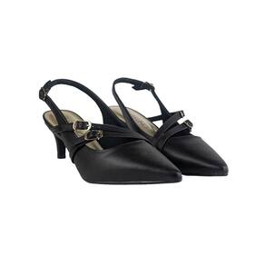 O estilo slingback, que deixa o calcanhar à mostra, garante um visual moderno e sofisticado, ideal para compor looks formais ou casuais refinados.