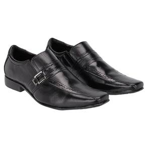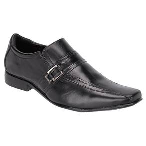 Sapato Masculino Design Italiano com forma alongada em Couro, solado de borracha costurado e tira de metal na pala.