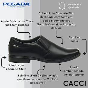 O Sapato Social Pegada Masculino Couro 122318 possui cabedal é em couro, o melhor material na fabricação de produtos de qualidade superior. A a palmilha em sintético perfurado garantem conforto e auxiliam na transpiração do pé O solado é leve e flexível, e conta com a tecnologia leviech que proporciona maior leveza e conforto no caminhar. O modelo ainda possui elástico em ambos os lados, conferindo alta praticidade “Calce Fácil”.
