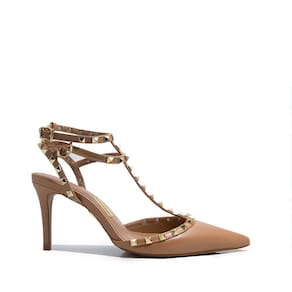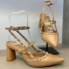 Sapato Uza Com acabamento em couro elegante, esse modelo conta com tiras enfeitadas por spikes dourados e salto fino. Ideal para compor looks poderosos e versáteis, do dia à noite. Aposte nesse design que une sofisticação e atitude em cada detalhe!