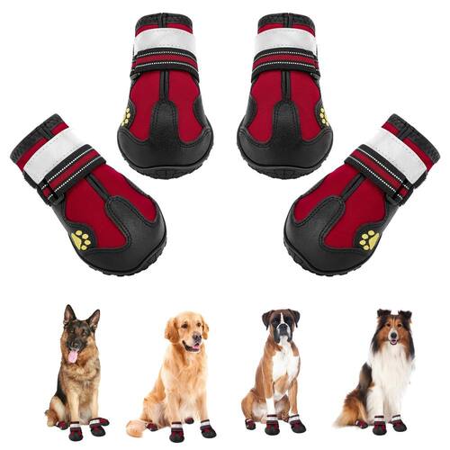 - 🐶?Confortável?: Essas botas para cães são flexíveis o suficiente, absolutamente macias e protegem as patas. Portanto, permita que as botas grandes para cães sejam usadas em ambientes internos ou externos, quentes e frios, confortavelmente em condições úmidas e secas. As botas para cães protegem os cães de espinhos afiados e do pavimento quente. Protege eficazmente as garras dos cães do calor, pedras, vidro, etc. As botas protegem a pata fraca da neve, gelo e sal durante o inverno.