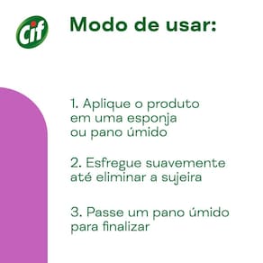O limpador de casa cremoso é mais concentrado e rende 7 garrafas do limpador comum**. Sua fórmula, poderosa, limpa sem riscar***, removendo toda a sujeira desde a mais pesada até a limpeza de casa do dia a dia, deixando um brilho imbatível. Limpe toda sua casa usando o Cif Cremoso Floral, que limpa todo tipo de objeto, como eletrodomésticos, potes plásticos, pias, brinquedos das crianças, persianas, pisos e até ajuda a deixar aquele cabo de carregador de celular como novo! Com o Limpador Cif, a limpeza nunca foi tão fácil e versátil. A linha do milagroso Cif Cremoso possui outras variedades de perfumes como, Limão e Laranja, que se adaptam ao seu estilo. Conheça a linha completa de produtos de limpeza Cif que não podem ficar de fora da sua lista de material de limpeza. Modo de usar: 1. Agite antes de usar. 2. Aplique uma pequena quantidade do produto sobre uma esponja ou pano úmido. 3. Esfregue a superfície suavemente até eliminar a sujeira. 4. Passe um pano úmido para finalizar. 5. Feche a embalagem após o uso. *Consulte lista das superfícies em www.ciflimpadores.com.br **Manchas de sabão e gordura queimada, comparado com limpadores comuns do mercado. Consulte a diferença de preços entre produtos. ***Não usar esponja ácida, como palha de aço, para a limpeza de vidros. ****Sujeiras testadas: Terra em tênis de couro sintético, giz de cera em parede lavável, óleo em aço inox e alumínio, sebo e espuma de sabão em azulejo, ketchup em granito e azulejo.