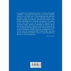 Este pequeno livro de Eduardo Calbucci contém uma grande novidade, a novidade do talento de um escritor verdadeiramente vocacionado para o desvendamento dos mistérios da leitura crítica do texto. Por isso, Eduardo evitou o desgastado caminho da polêmica, optando pelo estudo e pela reflexão disciplinada. O resultado não poderia ser melhor, porque nada supera o encanto de um livro agradável e útil ao mesmo tempo. Destina-se sobretudo aos leitores que se aproximam do universo romanesco de José Saramago. Todavia, será igualmente útil àqueles que já o leram mas carecem ainda de orientação metódica para seu entendimento. Escrita bem antes da consagração pelo Prêmio Nobel, esta obra possui a virtude de introduzir o leitor no civilizado hábito de discutir as coisas que aprecia. [Ivan Teixeira]