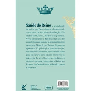 Saúde do Reino é a totalidade da saúde que Deus oferece à humanidade como parte do seu plano de salvação. Ela inclui cura física, mental e espiritual. Viver plenamente a Saúde do Reino é ter essas três áreas saradas e abundantemente saudáveis. Neste livro, Tatiana Capanema apresenta 12 princípios poderosos que, em conjunto, oferecem um caminho claro para integrar a cura divina em todos os aspectos de existência, permitindo a qualquer pessoa conquistar a Saúde do Reino e desfrutar de uma vida feliz, plena e vitoriosa. Nossa saúde espiritual é um reflexo direto da qualidade do relacionamento que temos com o Senhor, pois ele é o centro de nossa busca por significado e sentido na vida. Quando cultivamos uma conexão próxima com Deus, nossa saúde espiritual se fortalece, proporcionando uma paz interior duradoura e uma esperança que transcende as circunstâncias”. Tatiana Capanema