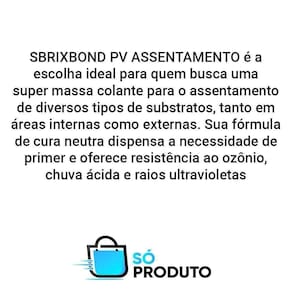 Sbrixbond pv assentamento - é a escolha ideal para quem busca uma super massa colante para o assentamento de diversos tipos de substratos, tanto em áreas internas como externas. Sua fórmula de cura neutra dispensa a necessidade de primer e oferece resistência ao ozônio, chuva ácida e raios ultravioletas. Além disso, a super massa colante não é afetada em áreas litorâneas. Com sua força de pega e elasticidade, a sbrixbond pv assentamento permite acomodação às movimentações entre base e substrato, distribuindo tensões e impedindo trepidações. Seu poder de adesão é surpreendente, assentando com perfeição a maioria dos materiais, incluindo metal, alumínio, aço, cobre, cimento, cerâmica, mármore, vidro, poliestireno, isopor, concreto, zinco, fibra, rocha ornamental, tijolo, azulejo, cortiça, gesso, porcelana, madeira e derivados, mdf, drywall, fórmica, borracha, acrílico, placa cimentícia, plásticos e pinturas. A sbrixbond pv assentamento é prática e segura, dispensando a necessidade de manipulação e garantindo estanqueidade à água, ar e pó. Isenta de odor, não é corrosiva e nem irrita a pele. É importante realizar testes de adesão antes da aplicação, e não é adequada para pe, pp, teflon e superfícies betuminosas. Se você busca uma solução eficiente e confiável para assentamento de substratos, a sbrixbond pv assentamento é a escolha certa para você