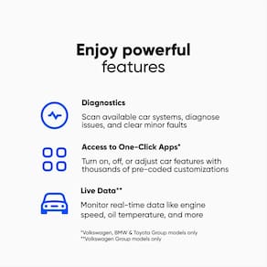 Comece a diagnosticar falhas e erros em seu carro — tudo com a ajuda de um dispositivo Bluetooth que se conecta à porta OBD-II do seu carro. Comece sua jornada em diagnósticos avançados com a ajuda de nosso leitor de código inteligente, que permite obter instantaneamente uma visão geral de qualquer tipo de problema em seu carro — tudo com a ajuda de um dispositivo pequeno e portátil que se conecta diretamente às unidades de controle do seu veículo e exibe as informações em seu smartphone via Bluetooth. O processo é simples: conecte sua ferramenta de digitalização OBDeleven à porta OBD-II do seu carro, baixe o aplicativo em seu smartphone e inicie sua conversa com seu veículo com um único toque na tela. Seu próximo scanner OBD-II - Melhore seu carro com a ferramenta de digitalização OBDeleven Escanear seu carro em busca de falhas ou códigos de erro nunca foi tão fácil, pois, com a ajuda de nosso scanner Bluetooth OBD-II, você pode verificar o bem-estar do seu veículo sem precisar ir a uma oficina. O leitor de carros funciona com todos os carros do Grupo Volkswagen (VAG), incluindo Volkswagen, Audi, Seat, Škoda, Lamborghini e Bentley, permitindo que você assuma o controle total do seu carro. Ative ou desative os recursos de conforto com os aplicativos OBDeleven One-Click Além de ser um scanner de carro, o OBDeleven é um dispositivo que permite melhorar seu carro com nossos aplicativos de um clique desenvolvidos internamente. Ajuste a resposta do pedal do acelerador, ative o Video In Motion no painel, ative o Needle Sweep Gauge Test, ative as luzes traseiras Scandinavian ou Urban Joke e vários outros recursos, tudo com um único clique de um botão no smartphone. - A escolha mais segura do mercado: o OBDeleven NextGen é uma ferramenta Bluetooth de diagnóstico e personalização de automóveis oficialmente licenciada pelas principais marcas de automóveis, como o Grupo Volkswagen (VAG), o Grupo BMW e o Grupo Toyota. - Diagnóstico rápido e abrangente: escaneie, leia, apague e compartilhe falhas de todas as unidades de controle em uma ampla variedade de veículos, como Audi, Volkswagen, BMW, Mini, Skoda, Seat, Cupra, Lamborghini, Bentley e Rolls-Royce. Com nosso leitor de código de carro inteligente, diagnostique facilmente problemas com seu motor, transmissão, ABS, airbag, multimídia, ar condicionado, eletrônica, volante, assistência e muito mais. - Personalizações fáceis com aplicativos de um clique (requer compra no aplicativo): escolha entre milhares de aplicativos prontos para uso — Aplicativos de um clique para veículos do Grupo Volkswagen e do Grupo BMW. Ligue, desligue ou ajuste os recursos de conforto, segurança e direção. Integre peças adaptadas, redefina as luzes de serviço, ative o vídeo em movimento, o Urban Joke e muito mais. - Uso intuitivo: você não precisa ser um profissional automotivo para diagnosticar e personalizar seu carro com o OBDeleven. Nosso aplicativo móvel fácil de navegar é para todos os motoristas, todos os dias, sem a necessidade de conhecimentos especiais. - Manutenção rápida e econômica do carro: evite visitas e reparos dispendiosos à oficina. Identifique problemas com antecedência e faça a manutenção do carro sempre que for conveniente para você. - Suporta Android e iOS: totalmente compatível com dispositivos móveis Android 8.0+ e iOS 15.0+.