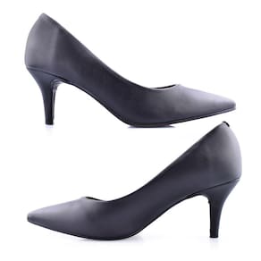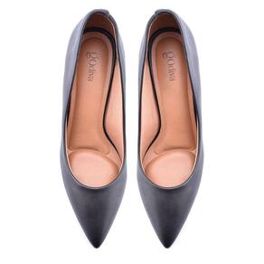 Scarpin fechado com salto médio, bico fino, em pelica preto, recorte arredondado no peito do pé e palmilha macia com aplicação da marca Godiva.