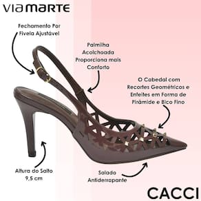 Elegância e personalidade se encontram neste modelo sofisticado de salto fino. Com recortes geométricos modernos e aplicação de pequenos detalhes metálicos na parte frontal, esse calçado transforma qualquer produção com um toque ousado e refinado.