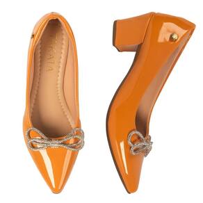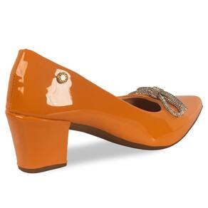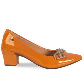 Scarpin Feminino Salto Grosso Verniz Laço Strass - 34 - Laranja