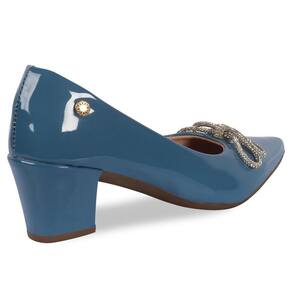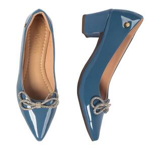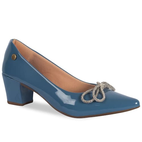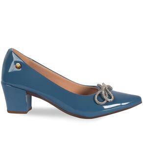 Scarpin Feminino Salto Grosso Verniz Laço Strass - 34 - Azul Petróleo
