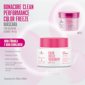 Máscara para cabelos coloridos. Schwarzkopf Professional BC Bonacure Clean Performance Color Freeze promove cuidado profundo para reparar intensamente os cabelos coloridos e traz de volta o nível de pH ideal de 4.5 aos fios.