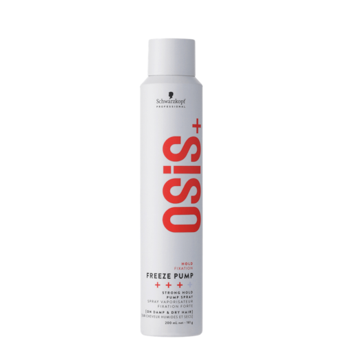 Spray capilar de fixação forte. Schwarzkopf Professional OSIS+ Freeze Pump proporciona máxima definição e alinhamento para estilização dos fios, principalmente em looks com ondas e cachos.