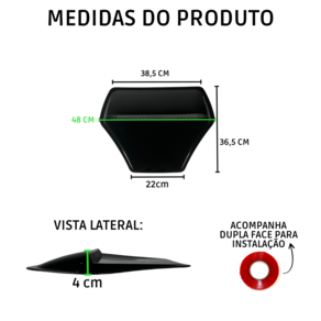 Características: - Entrada de ar funcional; - Para o uso decorativo, nenhuma ferramenta ou perfuração é necessária; - Fácil de instalar e uso durável;- Excelente qualidade; - Ótima decoração e adequada para a maioria dos veículos; - Aplicação é feita com fitas adesivas dupla face; - Produto leve e com alto desempenho.
