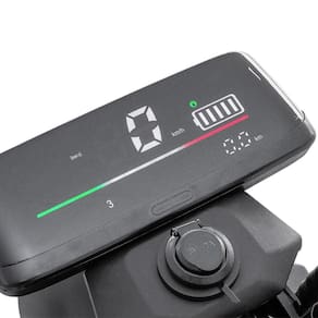 Painel digital com indicadores de velocidade, nível de bateria, hodômetro e Bluetooth