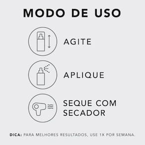 Modo de Aplicação: Para tratamento: após shampoo, aplique em cabelo úmido dividido em 4 seções, agite o produto e distribua uniformemente nos comprimentos e pontas, sem enxaguar, seguido de máscara. Para finalização: em fios úmidos limpos, divida em seções, aplique e modele. Use como protetor térmico antes de ferramentas de calor. Evite raiz para não pesar.