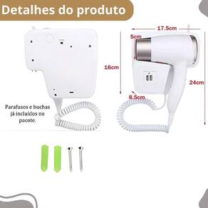 Secador compacto de parede branco para spas 220v Descrição do anúncio: Adicione sofisticação ao seu banheiro com o secador de cabelo de parede, perfeito para uso em casa ou em ambientes como hotéis, pousadas e spas. Compacto, leve e poderoso, este secador iônico cuida da saúde do seu cabelo, proporcionando um brilho e suavidade excepcionais. Com seu design resistente e funcionalidade avançada, ele é ideal para qualquer tipo de cabelo, seja liso, encaracolado ou ondulado. Conteúdo da embalagem: 1 secador de cabelo de parede 1 cabo espiral de poliuretano extensível até 1,6 metros Manual de instruções Características: Design compacto: fácil de armazenar e ideal para viagens. Funcionalidade iônica: reduz o tempo de secagem e elimina o frizz, proporcionando brilho e suavidade ao cabelo. Resistência: feito para suportar quedas, compressão e altas temperaturas. Ventilação poderosa: baixo nível de ruído e excelente dissipação de calor. Especificações: Potência: 1300w Frequência: 50hz Comprimento do cabo de energia: 70cm Comprimento do cabo do secador: até 1,20m cabo espiral Configurações: 2 ajustes ar frio e quente Material: plástico resistente Cor: branco Dimensões: 24 x 17,5 x 17cm 2x entradas usb Principais perguntas sobre o produto e respostas: 1 este secador é adequado para uso doméstico Sim, ele é ideal tanto para uso doméstico quanto para ambientes comerciais como hotéis e spas. 2 o cabo do secador é resistente Sim, o cabo espiral de poliuretano é altamente resistente, com boa extensibilidade e rápida retração. 3 posso usar este secador em uma tomada comum Sim, ele é compatível com tomadas de 10a. 4 o secador é barulhento Não, ele possui uma ventilação poderosa com baixo nível de ruído. 5 este secador pode ser em cabelos molhados Sim, ele é projetado para secar rapidamente cabelos molhados, mantendo a umidade natural e evitando danos. Marca: Não Informado