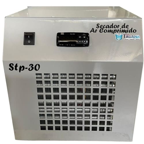Secador de ar comprimido mod. STP-30, capacidade Scfm / Nm 30/51 com purificador de ar embutido, descarga de impurezas automáticas, placa eletrônica com sistema inteligente para controle de temperatura de ponto de orvalho entre -35ºC. A +10ºC, com indicador de temperatura, gás de refrigeração R-134, conexão 1/2 BSP, pintura epóxi, estrutura em aço.