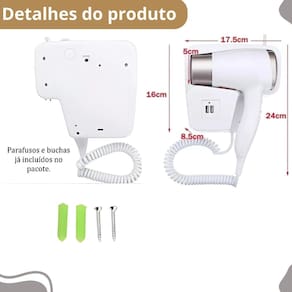 Secador de cabelo branco com suporte para hotéis 220v Descrição do anúncio: Adicione sofisticação ao seu banheiro com o secador de cabelo de parede, perfeito para uso em casa ou em ambientes como hotéis, pousadas e spas. Compacto, leve e poderoso, este secador iônico cuida da saúde do seu cabelo, proporcionando um brilho e suavidade excepcionais. Com seu design resistente e funcionalidade avançada, ele é ideal para qualquer tipo de cabelo, seja liso, encaracolado ou ondulado. Conteúdo da embalagem: 1 secador de cabelo de parede 1 cabo espiral de poliuretano extensível até 1,6 metros Manual de instruções Características: Design compacto: fácil de armazenar e ideal para viagens. Funcionalidade iônica: reduz o tempo de secagem e elimina o frizz, proporcionando brilho e suavidade ao cabelo. Resistência: feito para suportar quedas, compressão e altas temperaturas. Ventilação poderosa: baixo nível de ruído e excelente dissipação de calor. Especificações: Potência: 1300w Frequência: 50hz Comprimento do cabo de energia: 70cm Comprimento do cabo do secador: até 1,20m cabo espiral Configurações: 2 ajustes ar frio e quente Material: plástico resistente Cor: branco Dimensões: 24 x 17,5 x 17cm 2x entradas usb Principais perguntas sobre o produto e respostas: 1 este secador é adequado para uso doméstico Sim, ele é ideal tanto para uso doméstico quanto para ambientes comerciais como hotéis e spas. 2 o cabo do secador é resistente Sim, o cabo espiral de poliuretano é altamente resistente, com boa extensibilidade e rápida retração. 3 posso usar este secador em uma tomada comum Sim, ele é compatível com tomadas de 10a. 4 o secador é barulhento Não, ele possui uma ventilação poderosa com baixo nível de ruído. 5 este secador pode ser em cabelos molhados Sim, ele é projetado para secar rapidamente cabelos molhados, mantendo a umidade natural e evitando danos. Marca: Não Informado Ean: 7905276300591