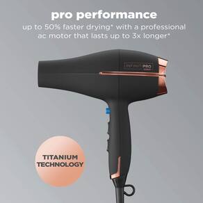 - Secador de cabelo profissional: este secador possui um motor AC de 1875 watts que fornece um fluxo de ar potente para secagem mais rápida e maior vida útil do secador, com tecnologia iônica para cabelos lisos, brilhantes e sem crespos